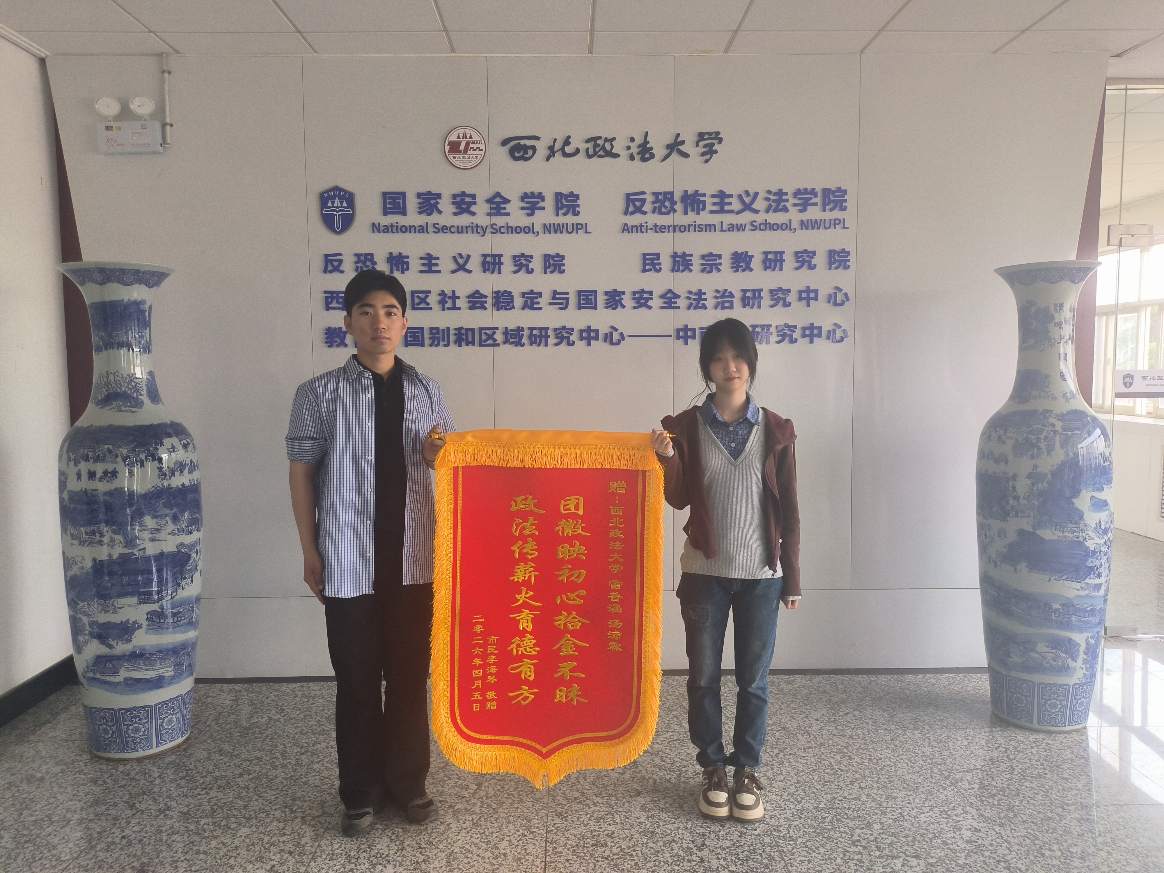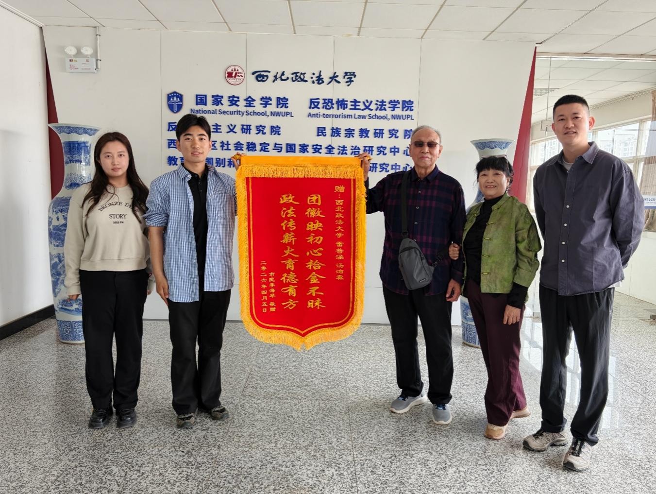 我院2023级本科生雷普涵获赠市民致谢锦旗。最近,一位年过七旬的市民奶奶与老伴专程来到西北政法大学长安校区,将一面写有“团徽映初心 拾金不昧,政法传薪火 育德有方”的锦旗送至国家安全学院,以此感谢我校同学拾金不昧的高尚品德,并对我校育人工作给予高度评价。