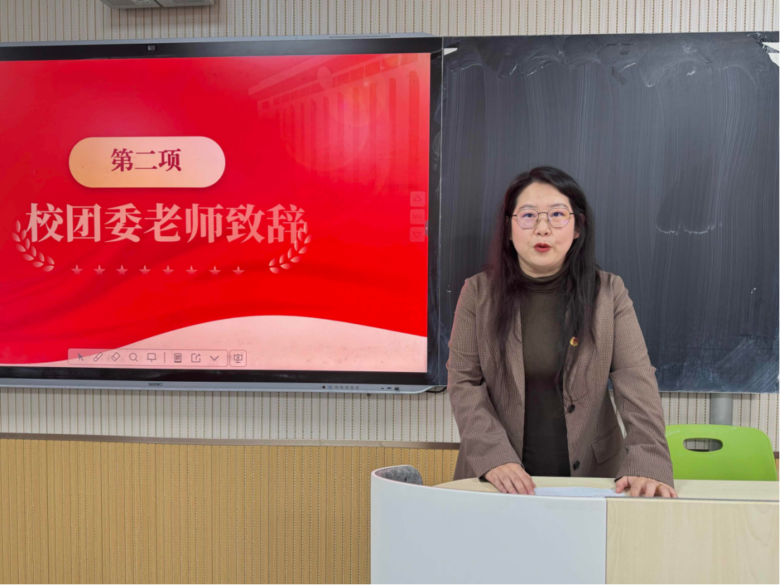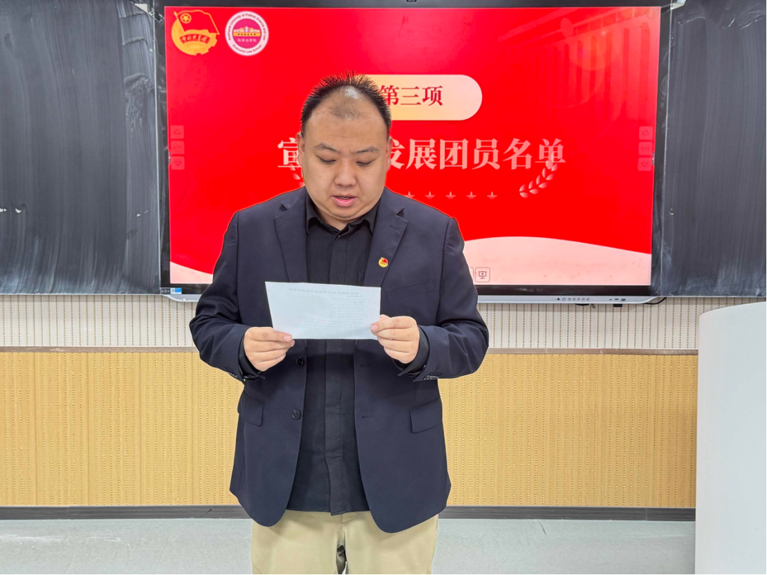 校团委副书记王洋代表校团委向新团员表示祝贺并致辞,希望新团员以入团为新起点,牢记誓言,将个人理想融入国家发展大局,在理论学习中坚定信仰、在实践锻炼中增长本领,同时期待基层团组织发挥桥梁纽带作用,带领青年学子为法治中国建设贡献青春力量。