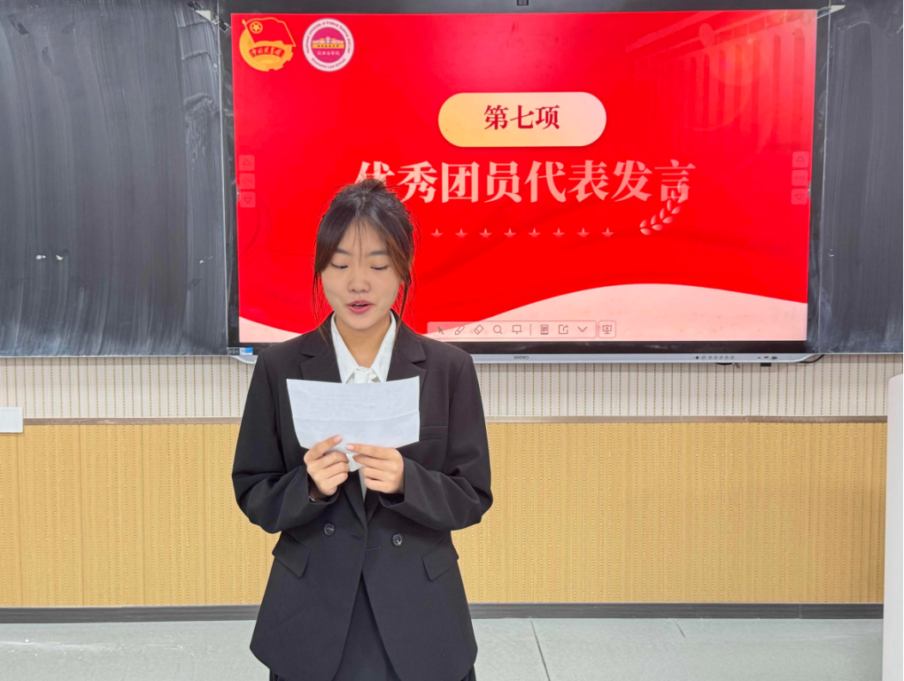 优秀团员代表贺佳妮回溯入团初衷,分享在团组织中的蜕变与感悟,号召新一代团员以知识为舟,在共青团的广阔天地中奋力前行。